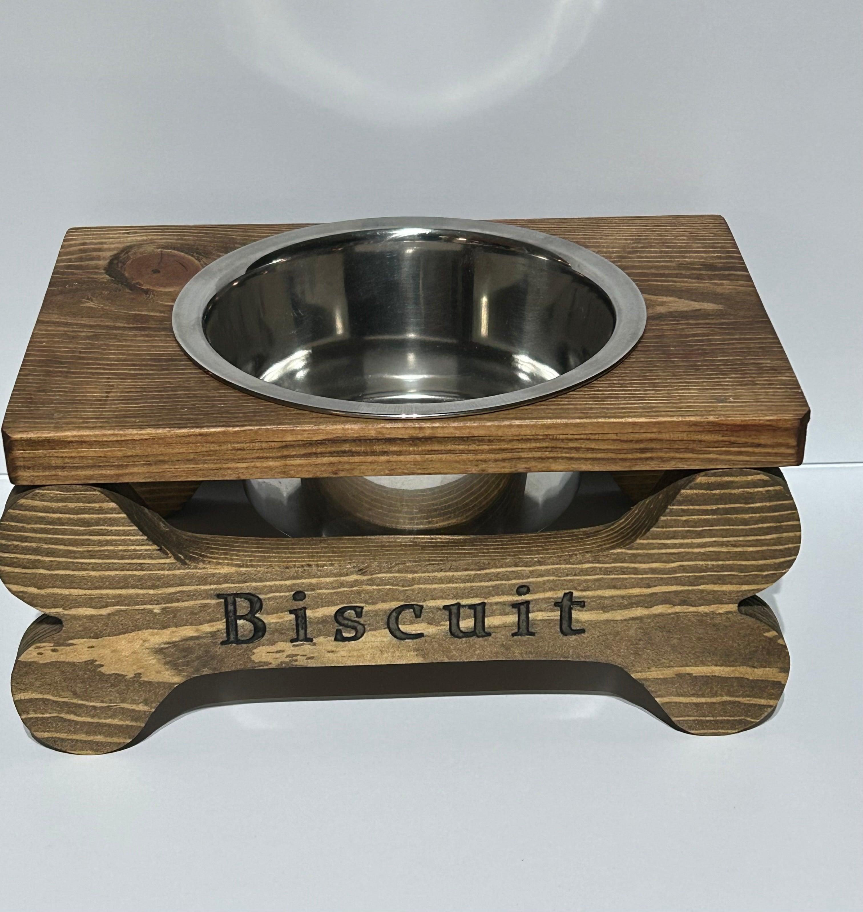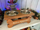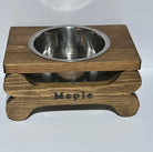 Spice up your pet's dining experience with our Medium Size Pet Feeder! Lovingly crafted, it includes one or two 32oz stainless steel bowls resting on two carved bones that read "Bon Appetit" or can be personalized with your furry pal's name. Made from sturdy pine and available in either early American or black whitewash stain. Let your fur baby dine in style!